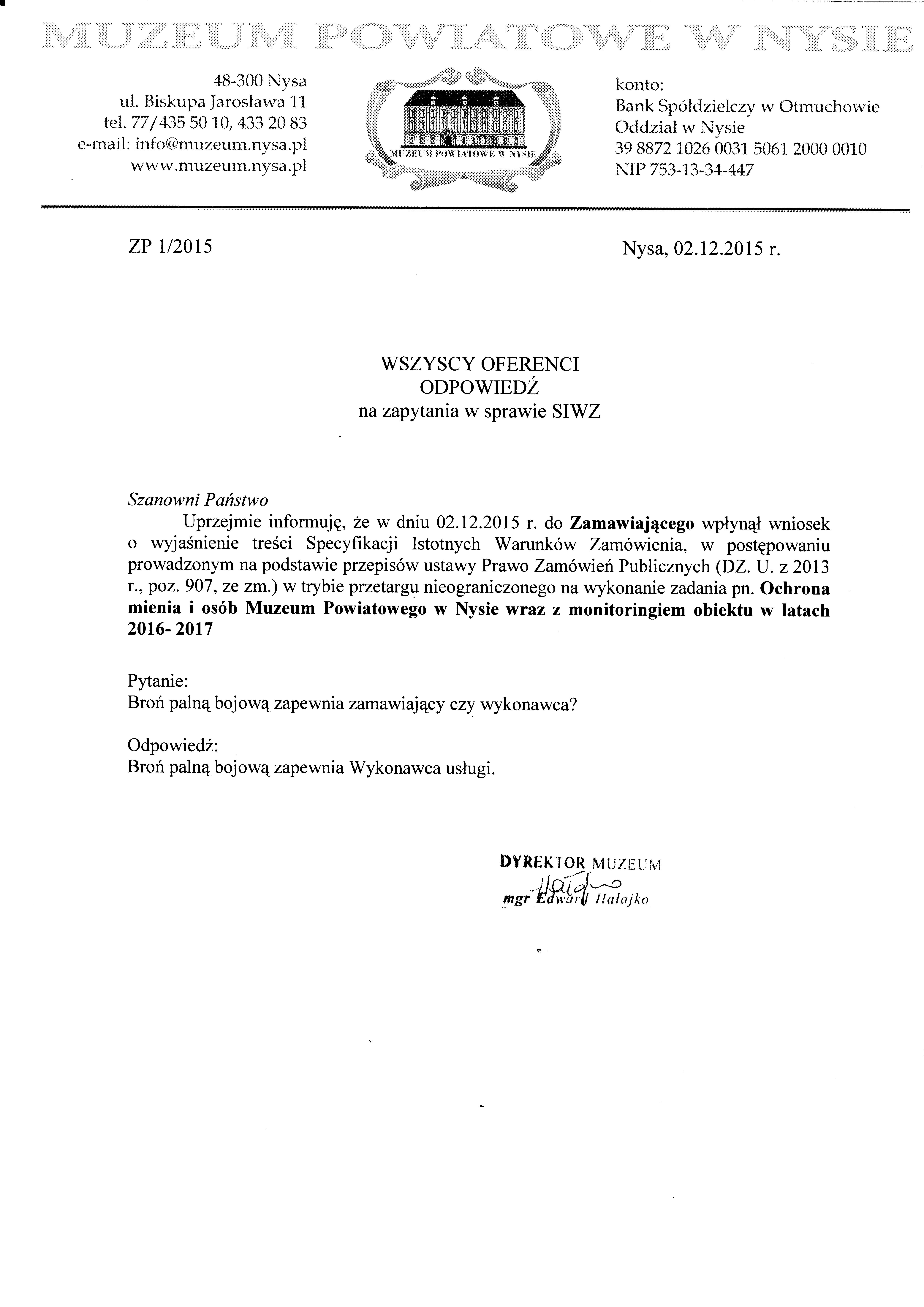 WYJAŚNIENIA !!! nr 2 - Ochrona mienia i osób Muzeum Powiatowego w Nysie wraz z monitoringiem obiektu w latach 2016- 2017